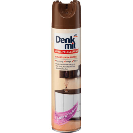 Спрей по уходу за мебелью Denkmit Möbel-Pflegespray очищает, ухаживает и защищает, благодаря антистатической формуле, деревянные, пластмассовые и стеклянные поверхности от быстрого оседания пыли. Одновременно сокращаются аллергены пыльцы сокращаются. Не содержит в составе воска, оставляет приятный аромат.